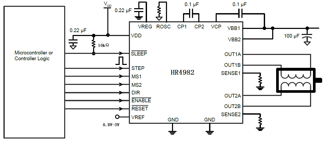 译码器是HR4982易于实施的关键。通过STEP简单的输入一个脉冲就可以使电机完成一次步进,省去了相序表,高频控制线及复杂的编程接口。这使其更适于在没有复杂的微处理器或微处理器负担过重的场合。