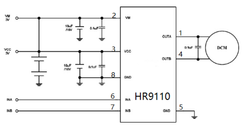 HR9110是应用于直流电机方案的单通道H桥驱动器芯片。HR9110的H桥驱动部分采用低导通电阻的PMOS和NMOS功率管。低导通电阻保证芯片低的功率损耗,使得芯片安全工作更长时间。此外HR9110拥有低待机电流、低静态工作电流。这些性能使HR9110易用于各种低压直流电机驱动方案。