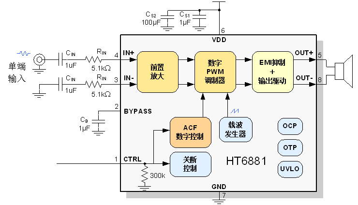 HT6881的最大特点是防削顶失真(ACF)输出控制功能,可检测并抑制由于输入音乐、语音信号幅度过大所引起的输出信号削顶失真(破音),也能自适应地防止在电池应用中由电源电压下降所造成的输出削顶,显著提高音质,创造非常舒适的听音享受,并保护扬声器免受过载损坏。同时芯片具有ACF-Off 模式。
