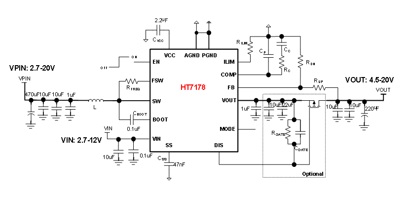 HT7178具有2.7V至20V宽输入电压范围,可为采用单节或两节锂电池,或12V铅酸电池的应用提供支持。该器件具备14A开关电流能力,并且能够提供高达20V的输出电压。