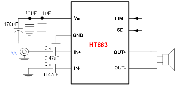 此外,HT863内部集成免滤波器调制技术,能够直接驱动扬声器,内置的关断功能使待机电流最小化,还集成了输出端过流保护、片内过温保护和电源欠压异常保护等功能。