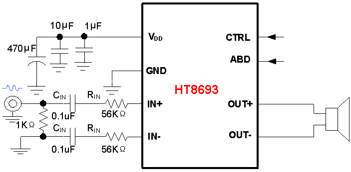 HT8693在D类工作模式下具有防削顶失真(ACF)输出控制功能,可检测并抑制由于输入音乐、语音信号幅度过大所引起的输出信号削顶失真(破音),显著提高音质,创造舒适听音享受,并保护扬声器免受过载损坏。同时芯片也具有ACF-Off 模式可配置。