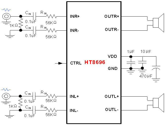 HT8696内部集成免滤波器数字调制技术,能够直接驱动扬声器,并最大程度减小脉冲输出信号的失真和噪音。输出无需滤波网络,极少的外部元器件节省了系统空间和成本,是便携式应用的理想选择。