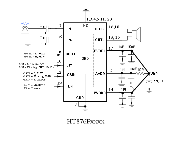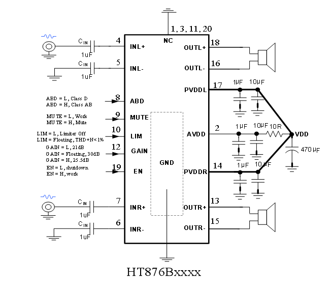 HT876还具有自动限温控制(TFB)功能,在高功率输出、高环境温度、AB类模式低效率等情况下导致芯片片内温度较高时,芯片能自动降低系统增益,避免芯片进入过温关断保护模式,在保证音乐品质的前提下显著提升音乐峰值功率。