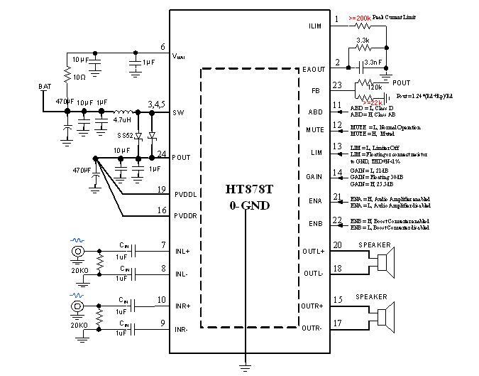 20 | OUTL+ | O | Positive output terminal (BTL+) for left channel. 左声道正端输出。 |