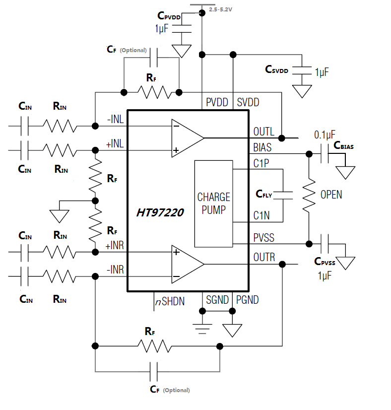 HT97220为差分输入、可直接输出的线路驱动器/耳机放大器。5V供电时,器件为32Ω耳机负载提供125mW驱动。IC可以通过外部电阻调整增益。